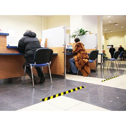 - Cinta adhesiva de marcado en el suelo que permite una gestión más eficaz de las colas de espera o zonas de acogida.