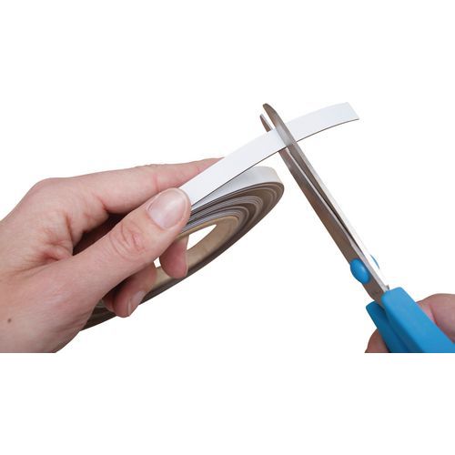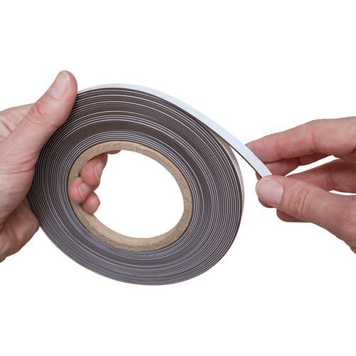 Cinta magnética flexible, con un grosor de 1 mm y diferentes anchuras entre las que elegir. A medida: se puede cortar a la longitud deseada con tijeras normales. Resistencia: 42 g/cm². Ideal para cambiar el marcado de estantes metálicos en almacenes o puntos de venta.