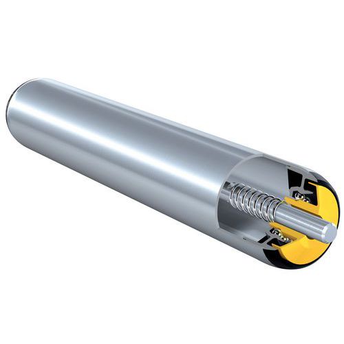 Cinta transportadora gravitacional con rodillos de acero y esqueleto metálico en C, acero 20/10º. Puede modularse con un elemento curvo cuyo chasis tenga la misma anchura. Chasis de la cinta transportadora robusta, cubierto con una pintura epoxi RAL 5017. Equipado con rodillos de acero galvanizado Ø 50 mm sobre rodamientos de bolas de manipulación, no requiere ningún mantenimiento. Rodillos con ejes con resortes para una sustitución sencilla.