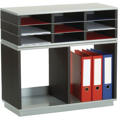 Estructura de poliestireno y estantes metálicos. Práctico y resistente clasificador con elementos modulables. Varias combinaciones posibles según el tipo de almacenamiento (plano o vertical). Posibilidad de superponer los módulos de almacenamiento horizontales abiertos y cerrados. Cajas para documentos de formato A4 que pueden contener un paquete de papel.