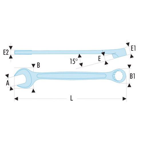 Llave estándar para todas las aplicaciones corrientes. Alto nivel de rendimiento mecánico, combinado con un tamaño reducido que respeta las normas aeronáuticas. Cabeza de ojo: - Liberación de ojo (lado E) diseñado para mejorar la accesibilidad a los tornillos en serie o empotrados. - Ojo 12 caras de perfil OGV® para una sujeción potente y protegiendo la tuerca. Sufijo H = ojo hexagonal. - Cabeza ojo inclinada a 15°. Cabeza horquilla: - Horquilla inclinada a 15°. - Geometría optimizada de la horquilla y del mango para una mayor accesibilidad. Dimensiones en pulgadas: de 1/4 a 11/2. Acabado: cromado satinado.