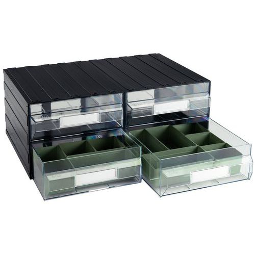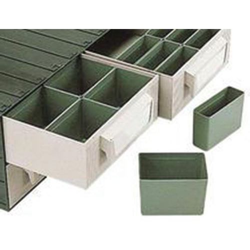 Compartimentos verdes desmontables de diversos formatos para distintos modelos de cajonera. Cree un espacio de almacenamiento claro para todo el material y todas las piezas.