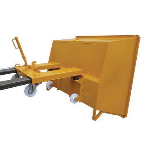 Contenedor autobasculante de baja altura con ruedas para un transporte fácil y seguro. Equipado con 2 ruedas fijas y 2 pivotantes para un manejo óptimo. Volquete autobasculante o manual para un funcionamiento flexible. Amortiguación de fin de vuelco mediante topes de goma para un funcionamiento suave. Mayor seguridad gracias al pestillo de seguridad que debe retirarse antes de volcar.