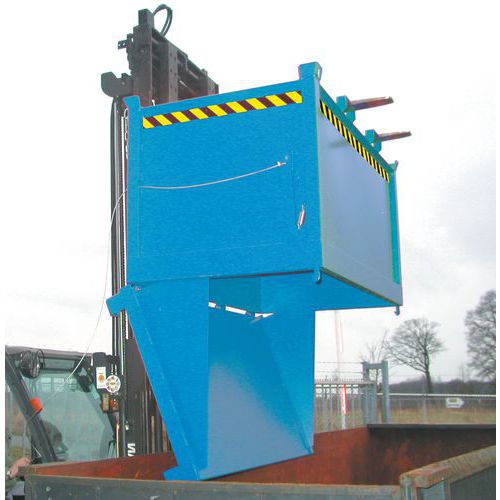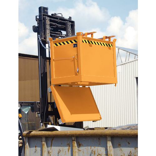 Apertura del contenedor desde la cabina mediante un cable. Cuenta con un parachoques de goma para amortiguar el impacto durante el vaciado. El fondo se cierra automáticamente cuando se coloca sobre el suelo. Materiales resistentes para una mayor durabilidad.