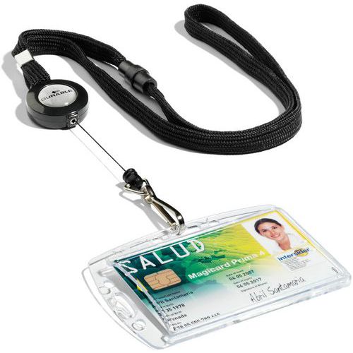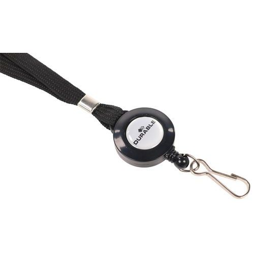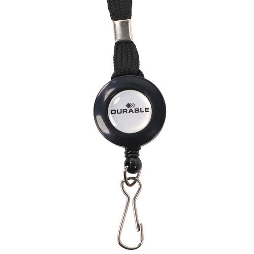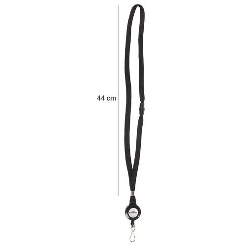 | Nombre del producto | Cordón de tela con enrollador y anclaje de mosquetón, Color: Negro, Longitudes: 801 mm, Material: Paño |