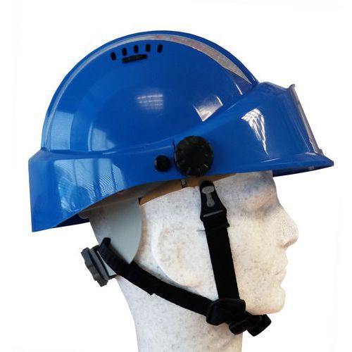 - Sujeción mediante banda de velcro (2 cm) en el lado de la nuca y sujeción por clip en el lado del arnés del casco.
