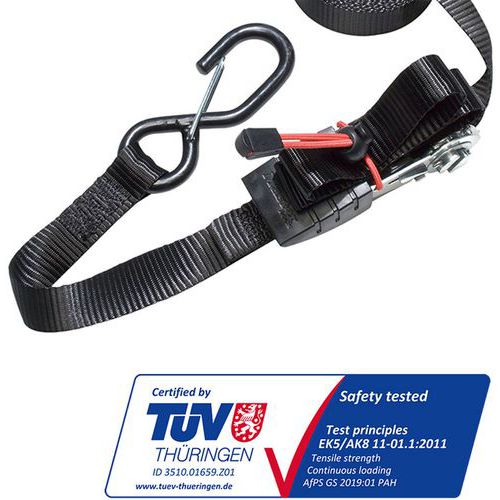 | Nombre del producto | Correa de trinquete, Longitud: 4250 mm, CMU: 400 kg, Ancho: 25 mm, Color: Negro, Correa material: Poliester |