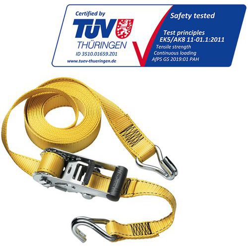 | Nombre del producto | Correas de trinquete con ganchos en J, Longitud: 4500 mm, CMU: 1250 kg, Ancho: 35 mm, Color: Amarillo |