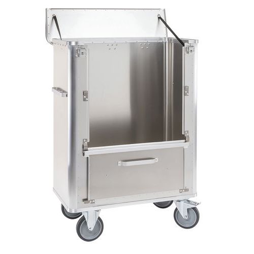 Carro contenedor de aluminio para uso universal. Higiénico, inodoro e inoxidable. Uso sencillo y ergonómico, incluso con una carga máxima. Superficie lisa y paredes no nervadas para una limpieza sencilla. Pared abatible que se mantiene abierta gracias a dos imanes. Tapa con bisagras, 2 correas de sujeción y 2 cierres de palanca. Fondo inclinado con 2 orificios de evacuación, ambos con válvula de evacuación, tapón y cadena. Fondo estanco con silicona. Asas anodizadas en las dos paredes frontales.