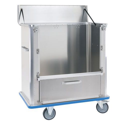 Carro contenedor de aluminio para uso universal. Higiénico, inodoro e inoxidable. Uso sencillo y ergonómico, incluso con una carga máxima. Superficie lisa y paredes no nervadas para una limpieza sencilla. Pared abatible que se mantiene abierta gracias a dos imanes. Tapa con bisagras, 2 correas de sujeción y 2 cierres de palanca. Fondo inclinado con 2 orificios de evacuación, ambos con válvula de evacuación, tapón y cadena. Fondo estanco con silicona. Asas anodizadas en las dos paredes frontales.