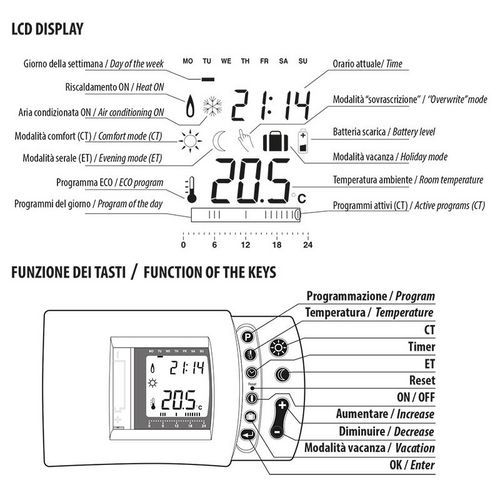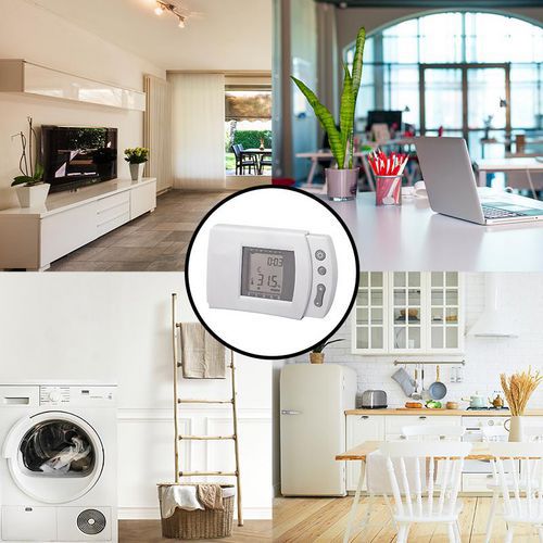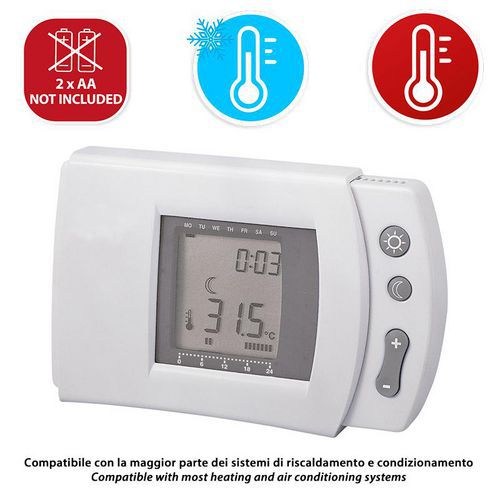 El termostato de ambiente le permite controlar la temperatura de su hogar, y es una comodidad de la que no puede prescindir. Con el cronotermostato digital Velamp, puede hacerlo de forma muy sencilla ajustando el calor deseado con un rango de control de +5 °C a +30 °C. Puede ajustar la temperatura de su hogar para cada hora del día (ciclo de 7 días). Funcionamiento: el termostato de la habitación se coordina con su sistema de calefacción. Podrá estar seguro de tener siempre calor en casa gracias a la función de protección contra heladas. La pantalla digital le permitirá controlar todas las funciones del termostato: encendido/apagado, sistema de calefacción en marcha, programa ECO en curso, nivel de batería, programa del día, hora, etc. Instalación sencilla: Velamp ofrece su experiencia incluso a los usuarios con menos conocimientos: es un termostato fácil de instalar, solo hay que conectar dos cables a la pared. Ideal para regular la temperatura de entornos domésticos, tiendas y oficin