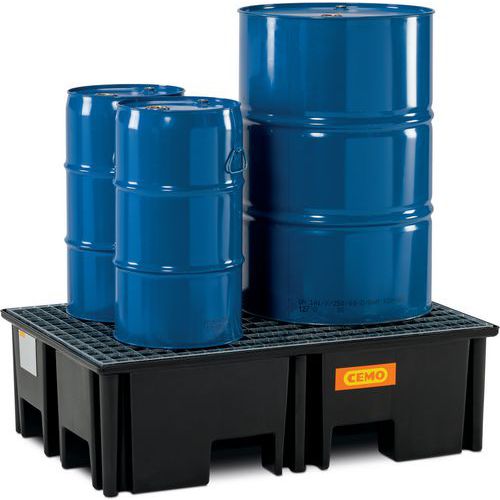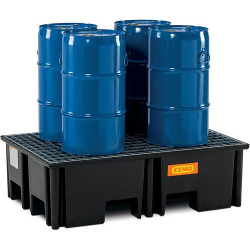Cubeta colectora ideal para el almacenamiento de palés que contengan barriles. Permite la retención de derrames de productos peligrosos o durante el llenado de los barriles.