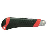Cúter de plástico bimaterial SIGN. Mango bimaterial de ABS para un agarre óptimo. Botón pulsador autoblocante. Guía de metal para la cuchilla. Con rompecuchillas.