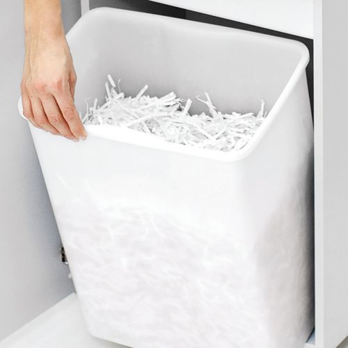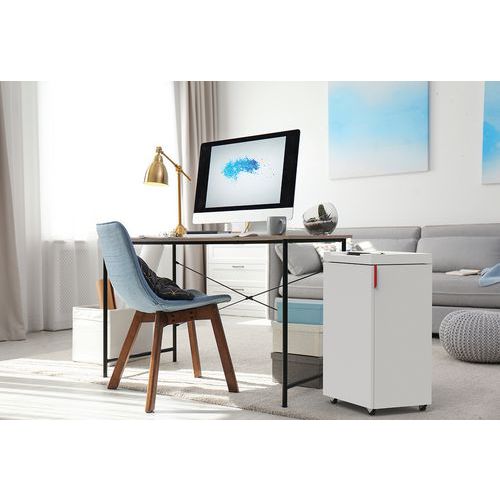 Destructor de documentos con sistema de protección y seguridad P-4. Smiley luminoso que indica la capacidad máxima de la destructora, evitando así los atascos. Bloque de corte de acero especial, robusto y seguro que puede destruir tarjetas y clips. Marcha/parada automática gracias a una célula detectora. Mueble de madera con puerta, montado sobre ruedas. Práctico receptáculo con asa de sujeción. Ideal para teletrabajo