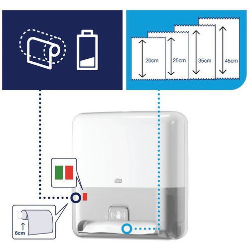 | Nombre del producto | Distribuidor eléctrico de papel para secar las manos Tork Matic Sensor, Color: Blanco, Altura: 400 mm |