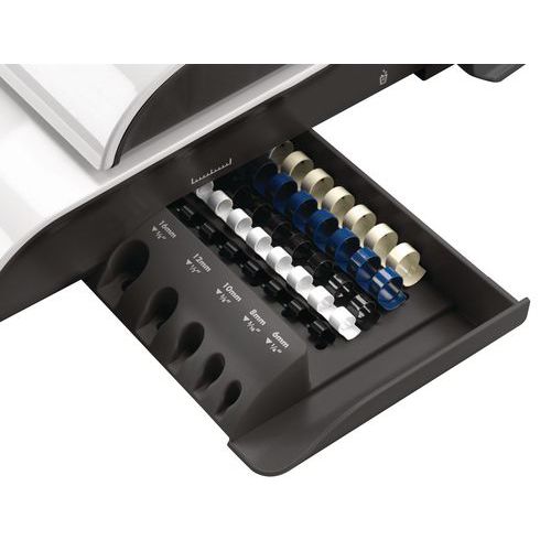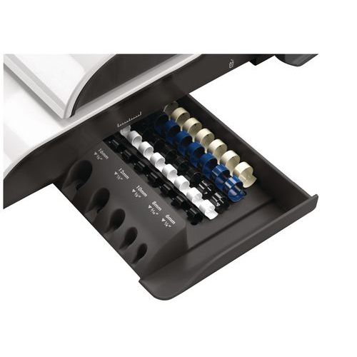 Encuadernación fácil gracias al soporte con dientes inclinados. Tope de alineación regulable para alinear con precisión todos sus documentos. Encuadernadora dotada de un cajón con espacio para accesorios y documentos. Apertura automática de la bandeja de restos de papel para evitar los atascos. Capacidad de encuadernación de 300 páginas con tapas de encuadernación de un tamaño máximo de 38 mm. Para perforar y encuadernar