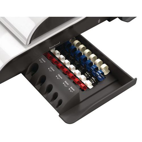 Encuadernación fácil gracias al soporte con dientes inclinados. Tope de alineación regulable para alinear con precisión todos sus documentos. Encuadernadora dotada de un cajón con espacio para accesorios y documentos. Apertura automática de la bandeja de restos de papel para evitar los atascos. Capacidad de encuadernación de 300 páginas con tapas de encuadernación de un tamaño máximo de 38 mm. Para perforar y encuadernar