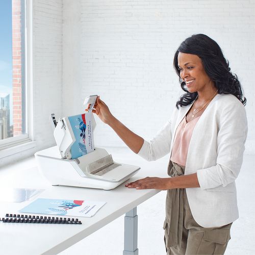 - Encuadernadora Lyra™ 3 en 1 fácil de usar para encuadernar, grapar y perforar documentos.