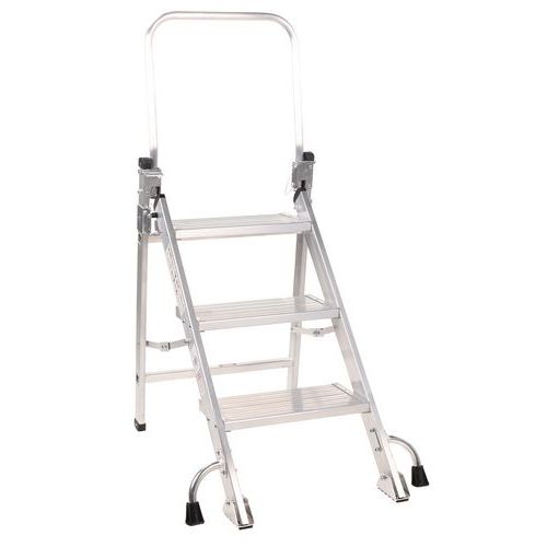 Escalerilla ligera y duradero con peldaños anchos Acceso seguro con barandilla en la parte superior. Gran estabilidad: patas dobles sobre el suelo en la parte delantera. Fácil almacenamiento gracias al plegado ultrarrápido de la estructura. Antideslizamiento garantizado con patas de aluminio recubiertas de goma.