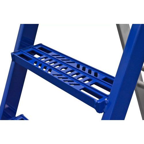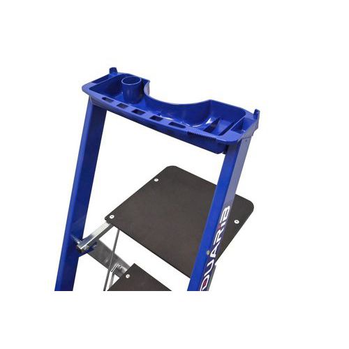 Escalera de aluminio lacado con balda abatible para un bote de pintura de 15 L (25 kg máx.). Balda para herramientas de gran capacidad con dos ganchos integrados. Peldaños fijados a los montantes mediante soldadura manual para una sujeción superior. Peldaños de rejilla antideslizantes de 100 mm de ancho, cómodos y fáciles de limpiar. Colocación sencilla y almacenamiento rápido.