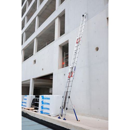 Escalera corredera de 3 tramos con cuerda y estabilizadores plegables de ajuste milimétrico. Amplias zapatas articuladas con suela antideslizante. Los pies se mantienen planos para garantizar una posición estable y cómoda. Manejo suave y sin agarrotamiento gracias a las correderas equipadas con guías de poliamida. Descenso controlado del tramo deslizante: sistema anticaídas de acero de doble brazo, con resistencia de hasta 350 kg. Estabilizadores de regulación milimétrica para la adaptación a todo tipo de entornos de trabajo. Patas siempre perfectamente planas gracias a la orientación estudiada de los barrotes. Amplios pies articulados equipados con una suela con muescas antideslizante.