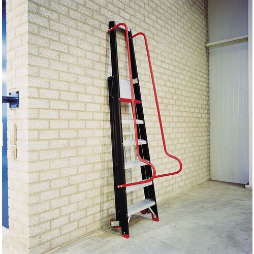 - Escalera de almacén fácil de mover con sus ruedas fijas en la parte posterior.
