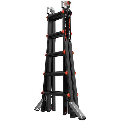 El ajuste telescópico permite su utilización en un suelo irregular y las ruedas fijas permiten mover la escalera fácilmente.