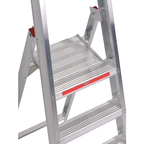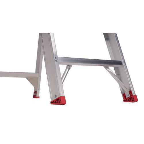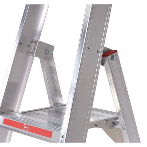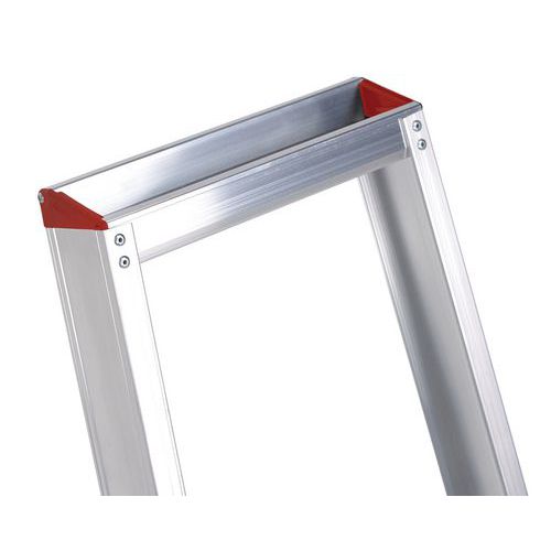 Escalera profesional de acceso simple muy ligera, con peldaños de perfil hueco. Los peldaños están fijados con remaches tubulares. De este modo, se pueden sustituir rápidamente si hace falta. Repliegue y despliegue la escalera de forma rápida y ágil, gracias al sistema de bisagra con bloqueo automático de la plataforma.