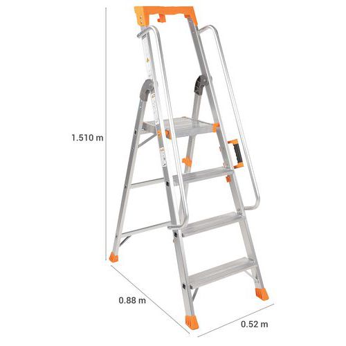 Escalera profesional de aluminio. Balda portaobjetos multifunción. Cómoda y segura con rampa. Perfiles reforzados de aluminio. Sistema de bloqueo de la plataforma. Peldaños antideslizantes. Fácil de transportar y de guardar. Carga máx. (kg) : 150 kg Garantía al cliente : 10 años