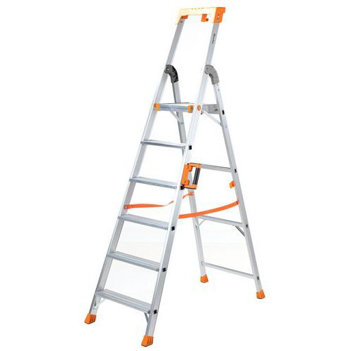 Balda portaobjetos multifunción. Perfiles reforzados de aluminio. Peldaños antideslizantes. Fácil de transportar y almacenar.