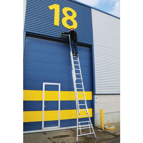 Escalera extensible, separable y transformable de tipo doble. Ganchos entre niveles para bloquear los dos elementos después de extenderla. Estabilidad lateral óptica asegurada gracias a la amplia base acampanada. Escalera de doble tramo con revestimiento de poliéster que no mancha las manos.