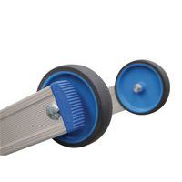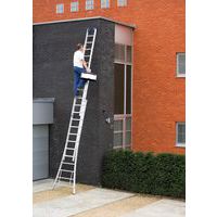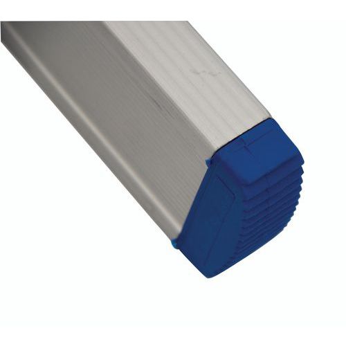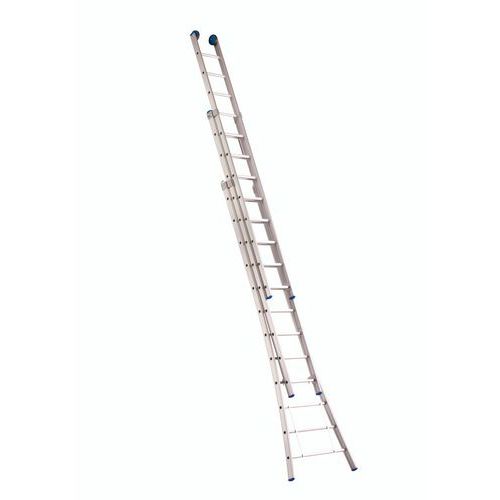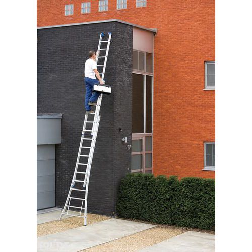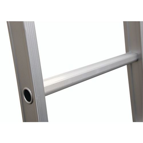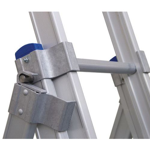 Escalera extensible, separable y transformable de tipo doble. Ganchos entre niveles para bloquear los dos elementos después de extenderla. Estabilidad lateral óptica asegurada gracias a la amplia base acampanada. Escalera de doble tramo con revestimiento de poliéster que no mancha las manos.