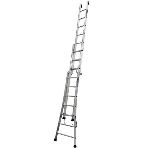 Escalera transformable de 3 tramos con base acampanada para compensar las irregularidades del terreno y evitar obstáculos. Articulaciones de fundición de aluminio. Fácil apertura de la escalera gracias a las guías integradas. Patines de pared para proteger las superficies en la posición de apoyo. Ganchos de acero con bloqueo para la retención del tramo. Correas antiextensión para una mayor estabilidad. Patines con base antideslizante. Cambio de posición sencillo y sin herramientas. Enganche de escaleras y separador de pared acoplables. Fabricación francesa. Perfiles de aluminio cerrados grandes. Garantía al cliente : 5 años Carga máx. (kg) : 150
