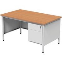 Escritorio con cajonera de la gama Confort 2. Patas de tubo cuadrado de 35 x 35 x 2 mm con refuerzo metálico en las esquinas. Patas ajustables de material sintético. Sólida estructura metálica de chapa de 1,5 mm. Las partes metálicas están pintadas con polvo de epoxi-poliéster. Altura fija de la mesa: estándar a 75 cm (incl. tope de 25 mm). Fabricado en la UE