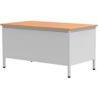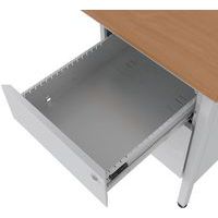 Escritorio con cajonera de la gama Confort 2. Patas de tubo cuadrado de 35 x 35 x 2 mm con refuerzo metálico en las esquinas. Patas ajustables de material sintético. Sólida estructura metálica de chapa de 1,5 mm. Las partes metálicas están pintadas con polvo de epoxi-poliéster. Altura fija de la mesa: estándar a 75 cm (incl. tope de 25 mm).