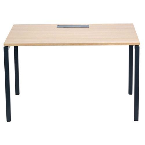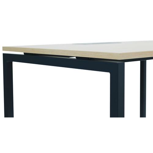 Escritorio recto con tablero melaminado de 25 mm y cantos de ABS de 2 mm. 2 travesaños de sujeción con un tubo metálico de 40 x 20 mm. Estructura con patas rectas de metal de 40 x 40 mm con patas de plástico para nivelación. Tablero suministrado con paso de cables con tapa para ayudar en la disposición de los cables.