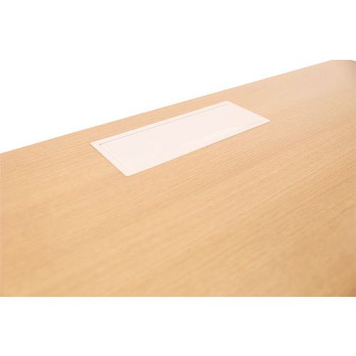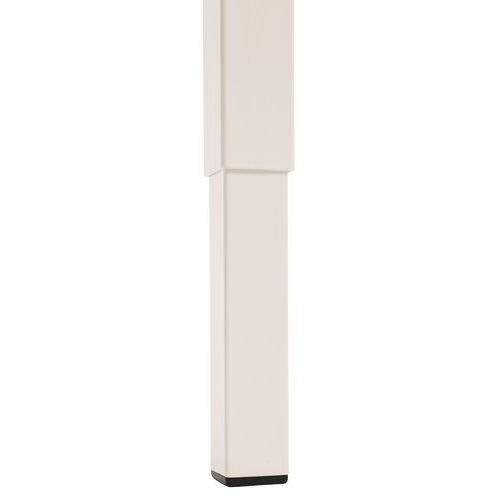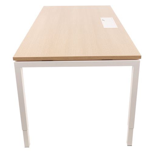 La altura del escritorio vertical se puede ajustar al nivel de las patas. Tablero melaminado de 25 mm y cantos de ABS de 2 mm. 2 travesaños de sujeción con un tubo metálico de 40 x 20 mm. Estructura con patas rectas de metal de 40 x 40 mm con cilindros de plástico para la nivelación. Tablero suministrado con paso de cables con tapa para ayudar en la disposición de los cables.