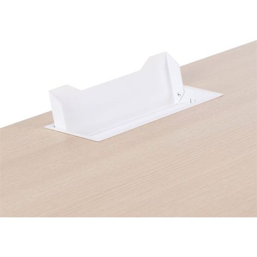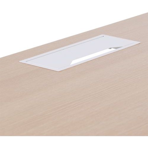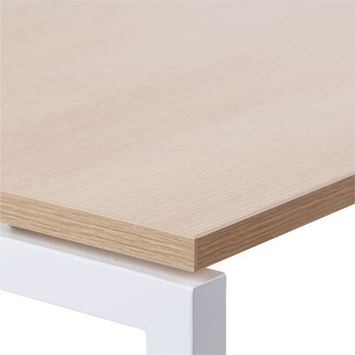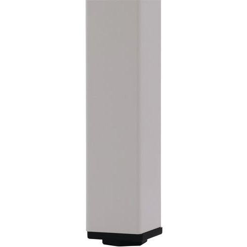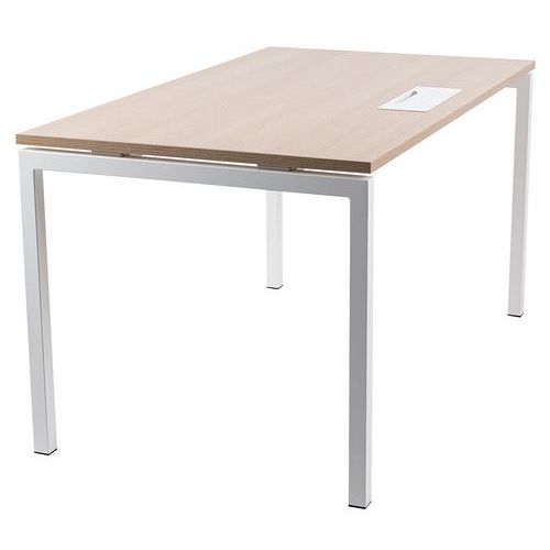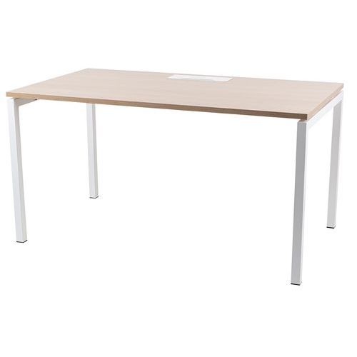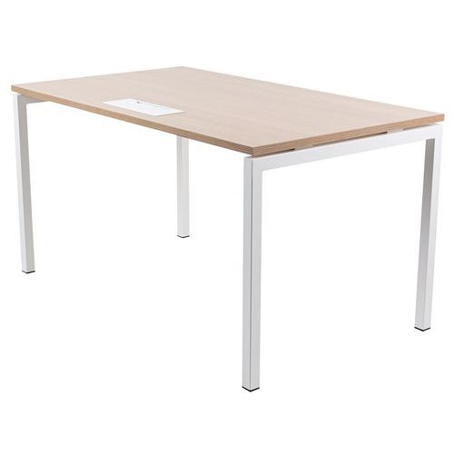 Escritorio recto con tablero melaminado de 25 mm y cantos de ABS de 2 mm. 2 travesaños de sujeción con un tubo metálico de 40 x 20 mm. Estructura con patas rectas de metal de 40 x 40 mm con patas de plástico para nivelación. Tablero suministrado con paso de cables con tapa para ayudar en la disposición de los cables.