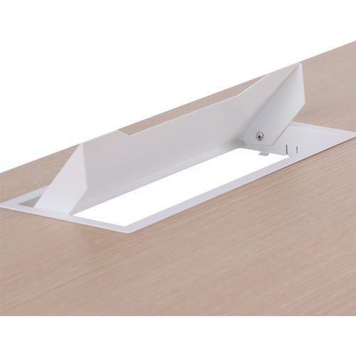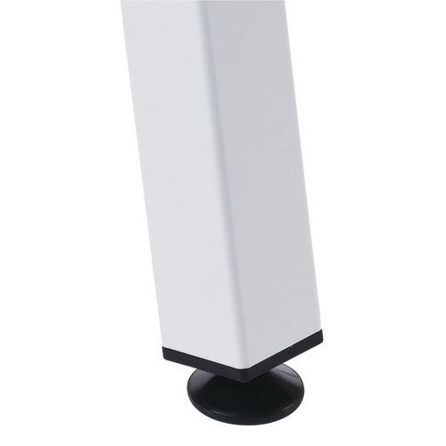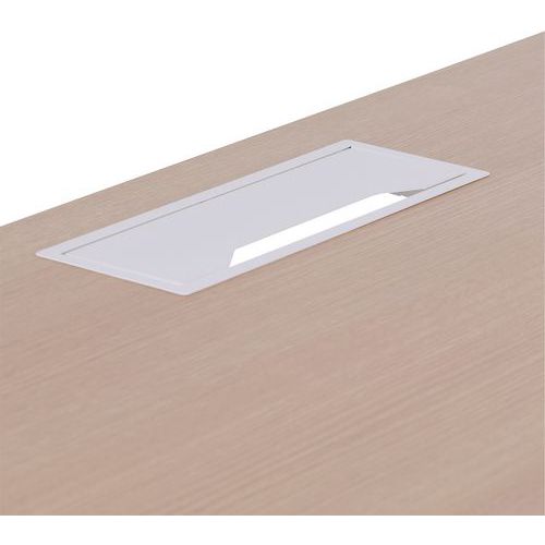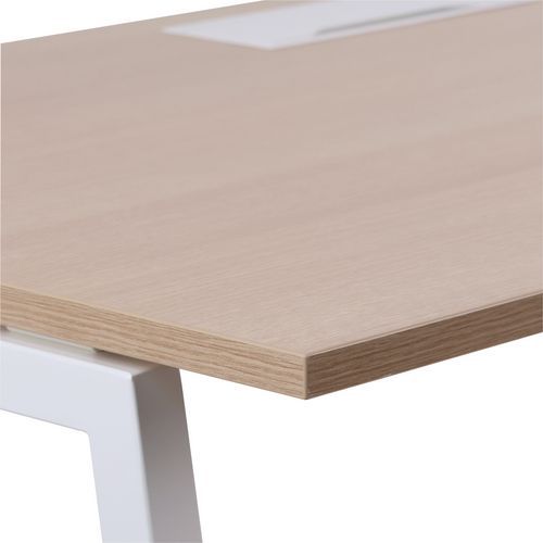 Escritorio recto con patas en arco (A). Tablero melaminado de 25 mm de grosor con cantos de ABS de 2 mm. 10 mm entre las patas y el escritorio. 2 travesaños de sujeción metálicos (40 x 20 mm) Tubo de patas de metal (40 x 40 mm) y cilindros de plástico para la nivelación (+10 mm). Tablero con corte para paso de cables con tapa.