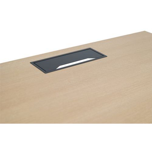 Escritorio recto con tablero melaminado de 25 mm y cantos de ABS de 2 mm. 2 travesaños de sujeción con un tubo metálico de 40 x 20 mm. Estructura con patas rectas de metal de 40 x 40 mm con patas de plástico para nivelación. Tablero suministrado con paso de cables con tapa para ayudar en la disposición de los cables.