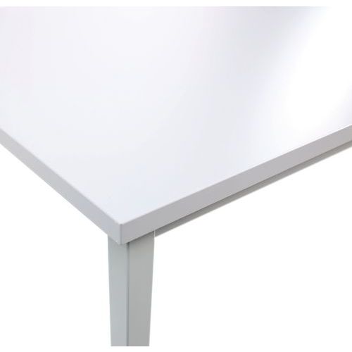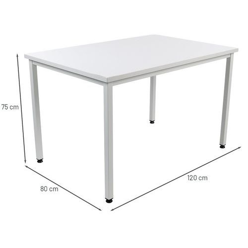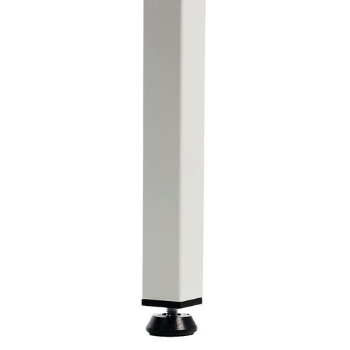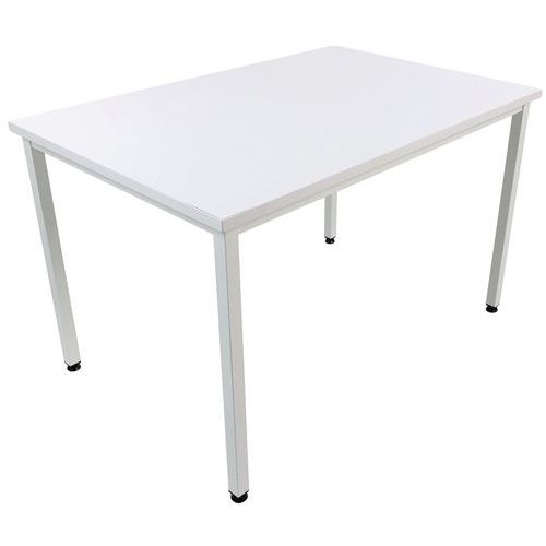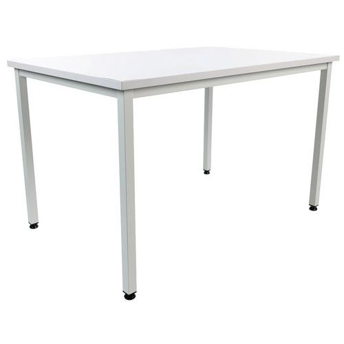 Mesa robusta e intemporal. Tablero antirreflejos de alta resistencia (grosor de 25 mm). Patas con pies regulables. Marco autoportante y panel de fondo metálico.