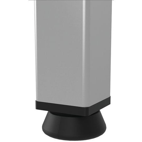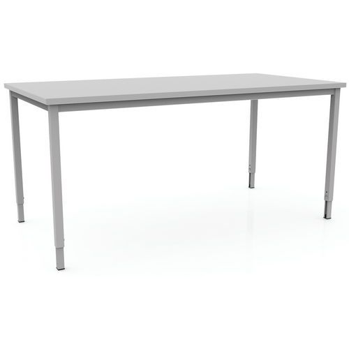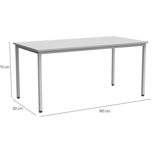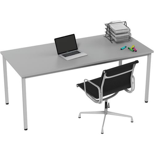 Mesa robusta e intemporal. Tablero antirreflejos de alta resistencia (grosor de 25 mm). Patas con pies regulables. Marco autoportante y panel de fondo metálico.
