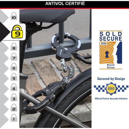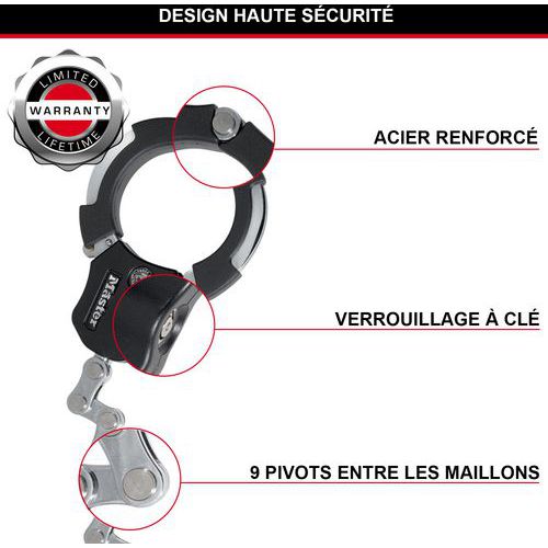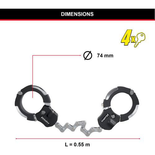 Esposas Street Cuff™ con cuerpo de acero endurecido de 74 mm de diámetro interior x 55 cm de longitud total - 9 eslabones - Se suministra con 4 llaves tubulares - Recubrimiento de ABS - Color: negro.