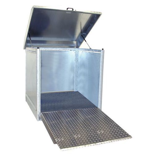 El techo se cierra mediante resortes de compresión de gas. Almacenamiento seguro de productos peligrosos. Sencillo mantenimiento gracias a la puerta abatible que sirve de rampa de acceso. Bastidor de chapa de acero galvanizada.