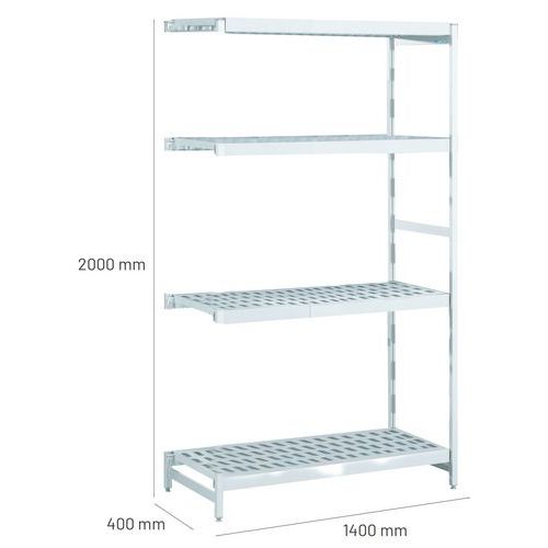 Estantería de alta resistencia a las temperaturas extremas. En aluminio anodizado y estantes de poliestireno perforado. Mantenimiento perfecto con estantes lavables en el lavavajillas. Patas regulables para alisar las irregularidades del suelo. Estantería simple para montaje fácil y rápido. Ideal para el sector de la alimentación y la hostelería, en restaurantes y comedores