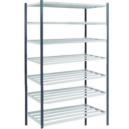 Estantería de bonito acabado de pintura epoxi, de estructura aireada tubular. Balda totalmente desmontable con conexión directa en montante. Gran estabilidad sin travesaño para un acceso simple y doble cara. Montaje y desmontaje completo y rápido, sin tornillos ni bulones. Montante perfil en T sin perforación en fachada (40x37).