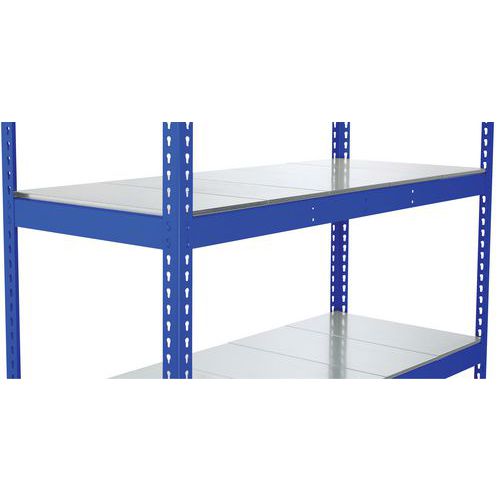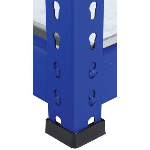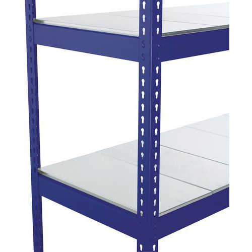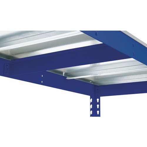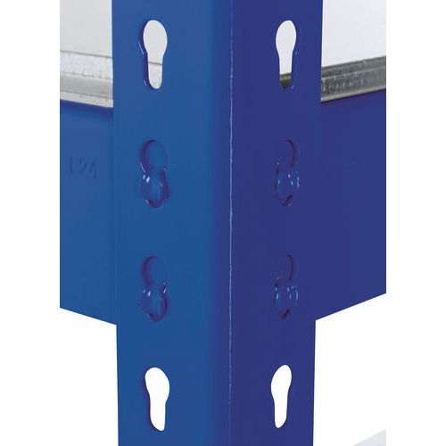 Estantería simple y sólida. Adecuada para almacenar grandes cajas de archivo. Balda maciza de acero galvanizado, material muy resistente a todo tipo de entorno. Acabado de pintura epoxi en montante y listón, de fácil mantenimiento, azul o gris claro. Estantería de almacén de montaje simple y rápido, sin necesidad de herramientas específicas.