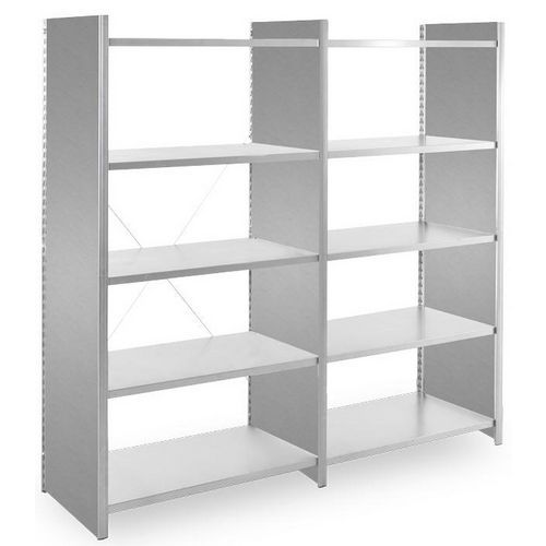 Estantería de oficina ligera y resistente. Acabado galvanizado. Estructura cerrada en los laterales con sólidos bastidores. Inoxidable: apta para los entornos húmedos. Puede ampliarse añadiendo uno o varios elementos adicionales. Acabado galvanizado ideal para piezas húmedas y situación en el exterior.