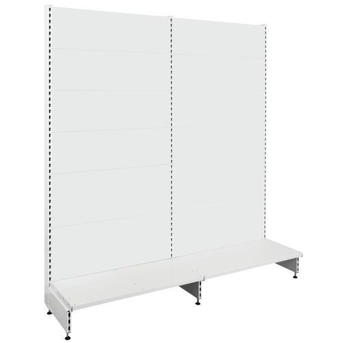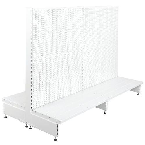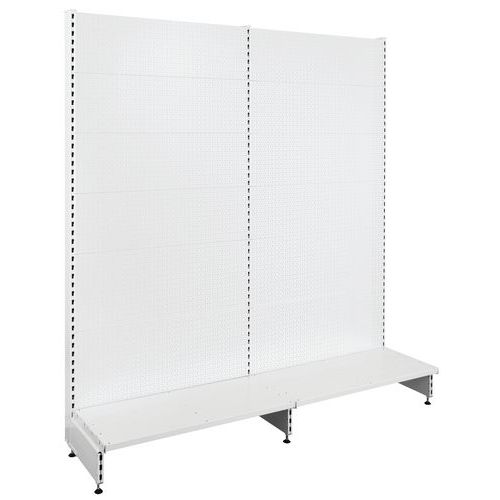 Kit de estantería para tiendas en acero blanco. Sistema encajable, sin tornillos ni pernos. Patas con tornillos para regular la altura. Estantería de excelente estabilidad con base de acero. 2 tipos de tabiques a elegir: lisos o perforados. Modelo perforado: perforación redonda euro. Estantería con un gran número de accesorios opcionales.