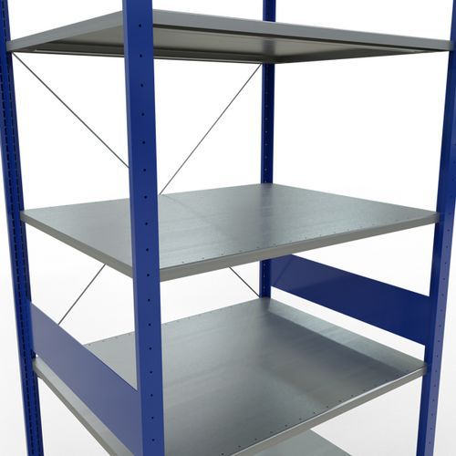 Sistema de estanterías robusto y muy completo con bello acabado pintado epoxi gris o azul. Las baldas macizas de acero chapado pueden soportar mercancías de múltiples dimensiones. Estantería industrial fácil y rápida de montar por acoplamiento, sin herramientas concretas. Extensión de estantería sencilla con adición de 1 o varios elementos adicionales.